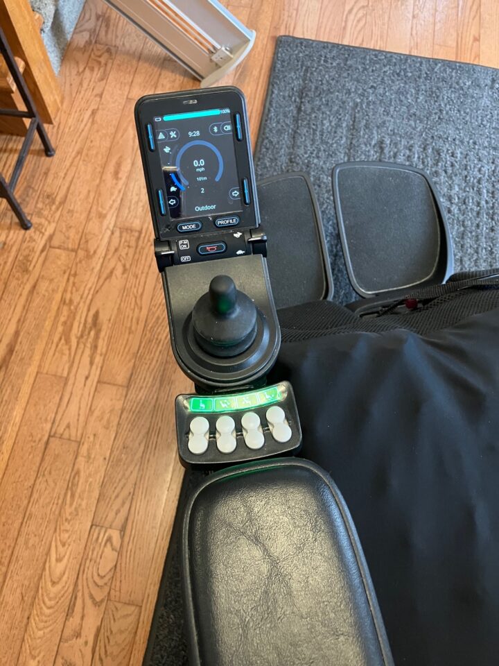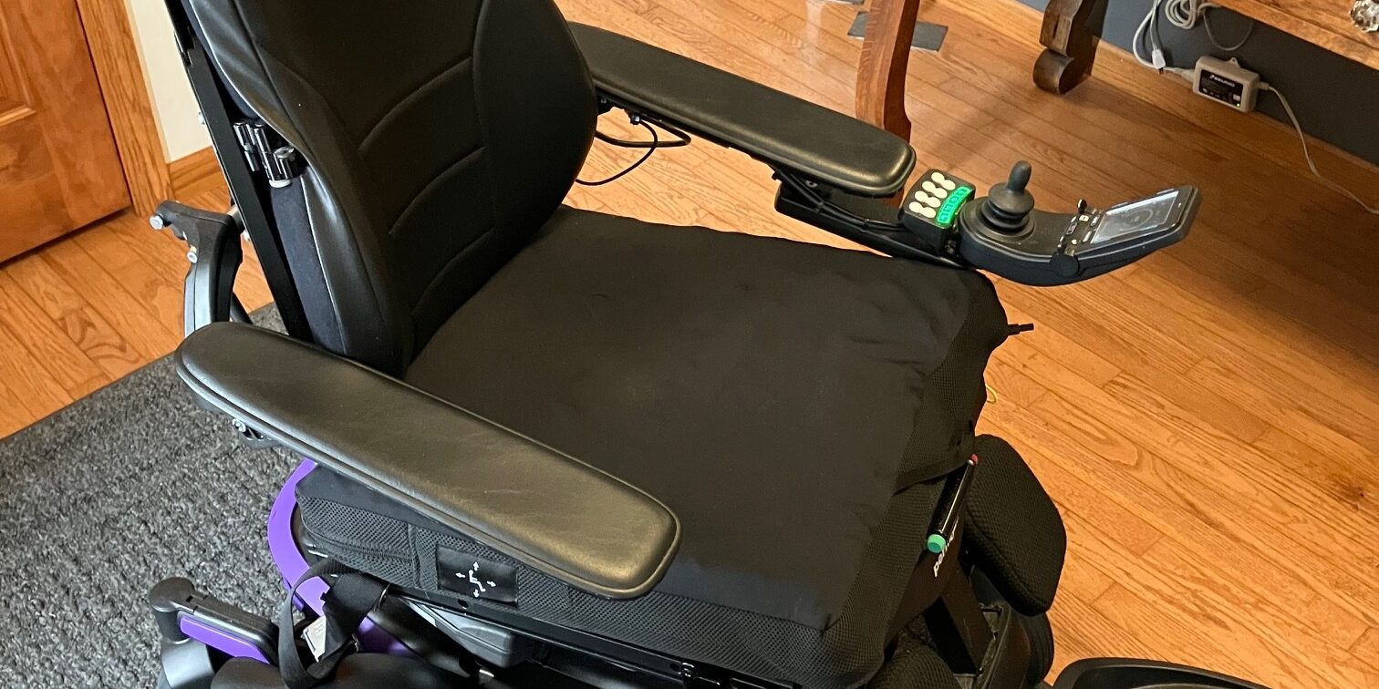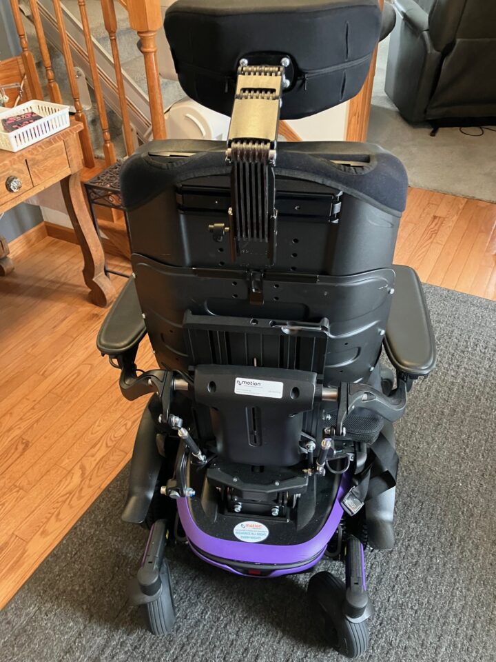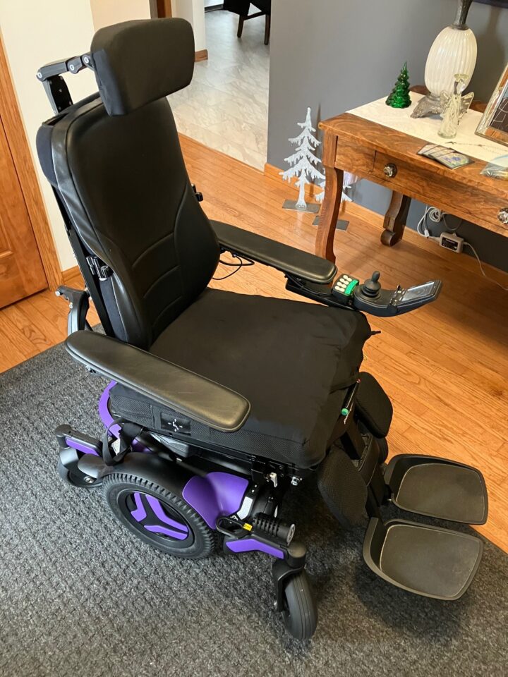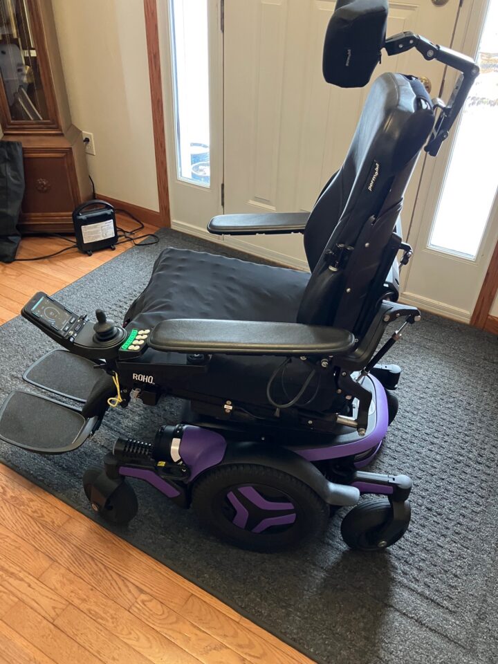Fully powered wheelchair. Full tilt, recline, and lift. Control can be either right or left hand. The chair and battery are in excellent condition. Includes additional leg, arm support pads and tool kit with full instruction manual. The seat is air flotation, includes hand pump. No rips, tears or scratches.